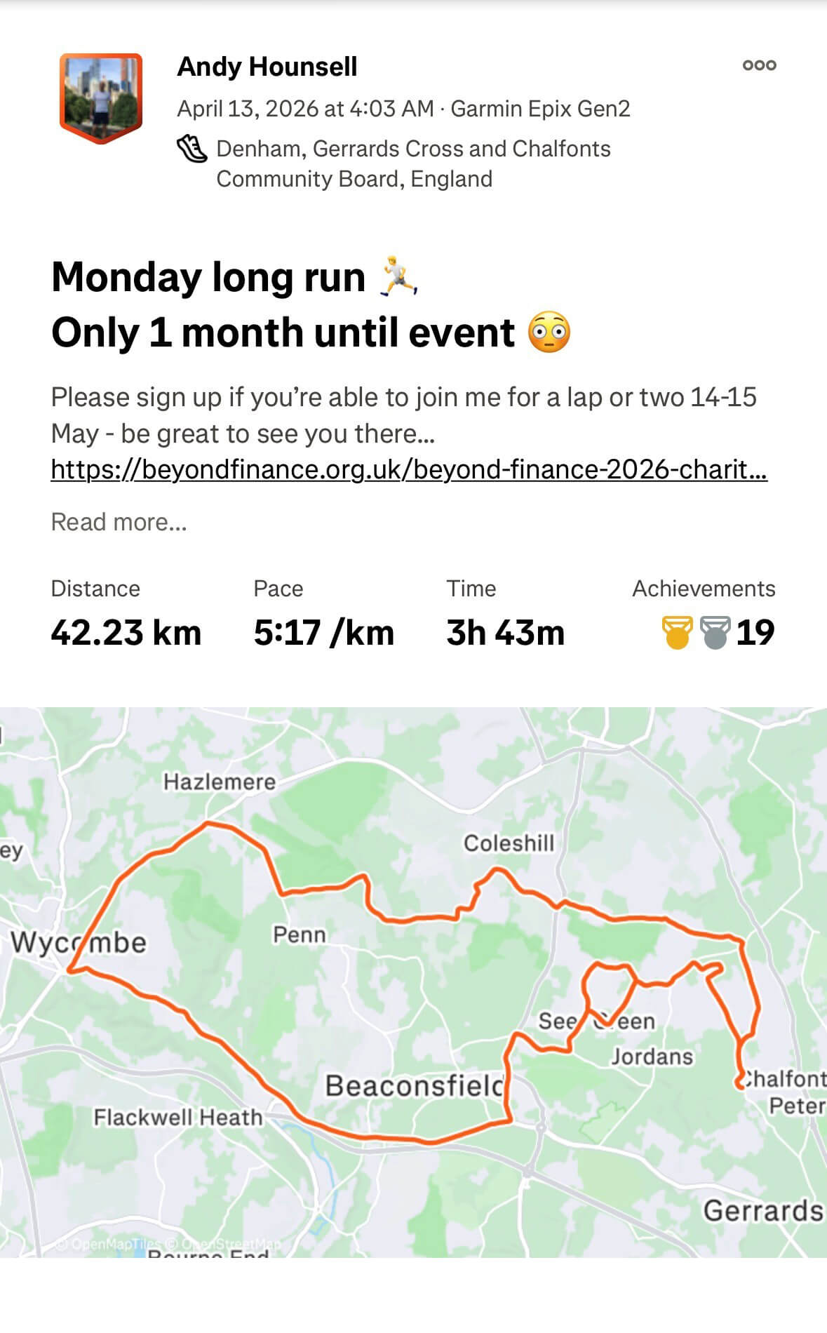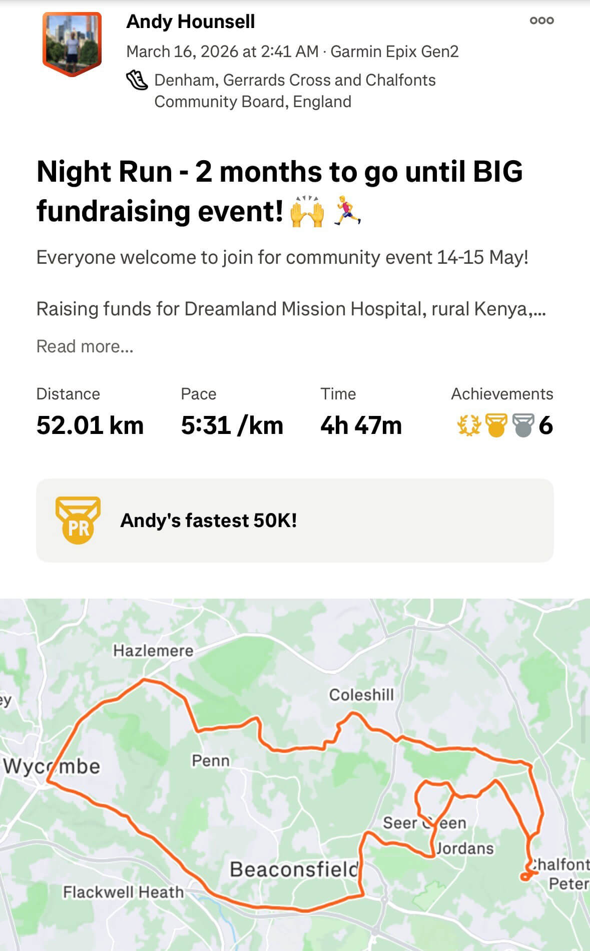 There is now just under three weeks until the event. I need to taper the volume of training to give my body the best possible chance of holding up over the full 24-hour period. I have taken the preparation for this challenge more seriously than ever before. I am mindful of the strain it will place on my joints and swelling in my ankles that will inevitably come. Over the past month or so, I have been doing weekly Monday marathons before work! One of those runs was 52km at 2:41 in the morning, helping me prepare for the physical and mental challenge of running long distances through the night on tired legs.