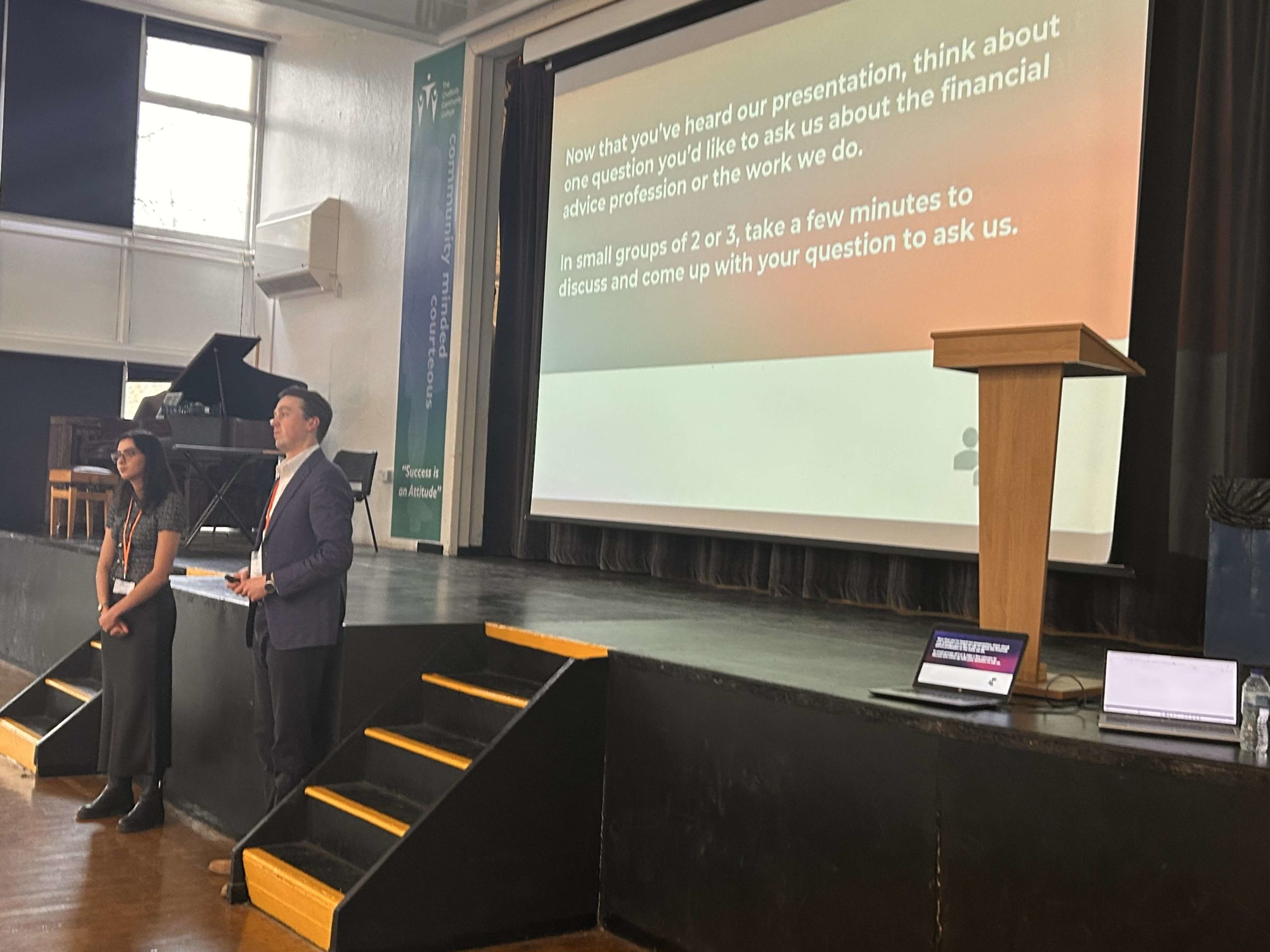 Josh and Maria returned on Friday 13 February to deliver a 45-minute assembly to nearly 200 Year 12 and 13 students, sharing their journeys into financial planning and practical tips on getting started with investing. The session also covered the role of a financial planner, different roles within the profession, common misconceptions and the basics of investing.